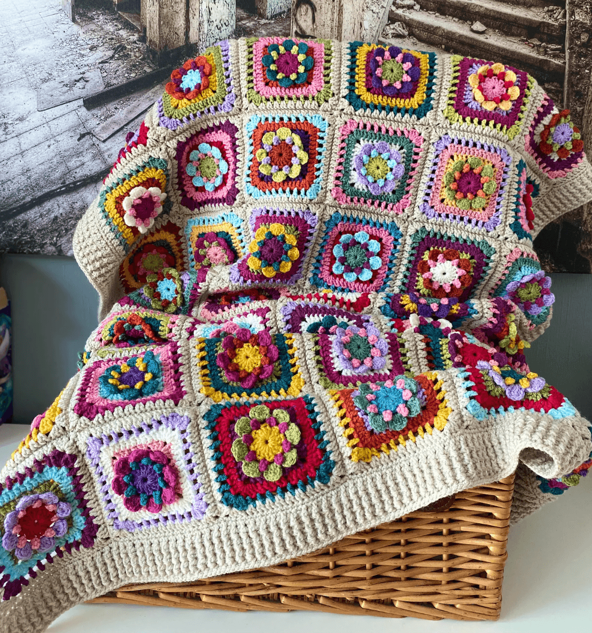 Easy to adjust the final size – simply crochet more or fewer squares. Each square measures apx. 23.5cm/9.25inches by 26.5cm/10.5inches when crocheted with DK-weight yarn.