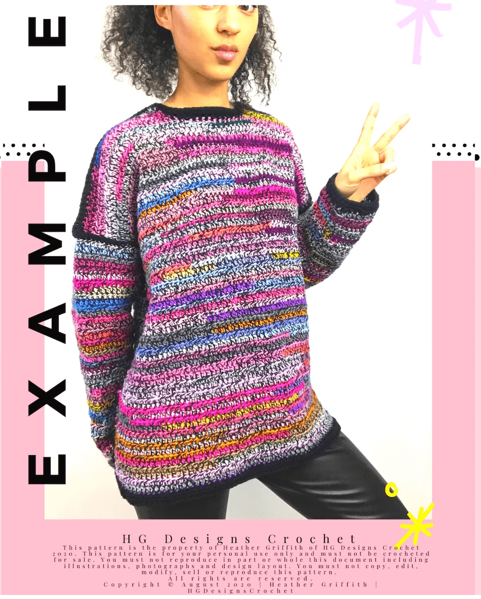 Consists of a front and back panel, sleeves crocheted in the round and contrast seaming.