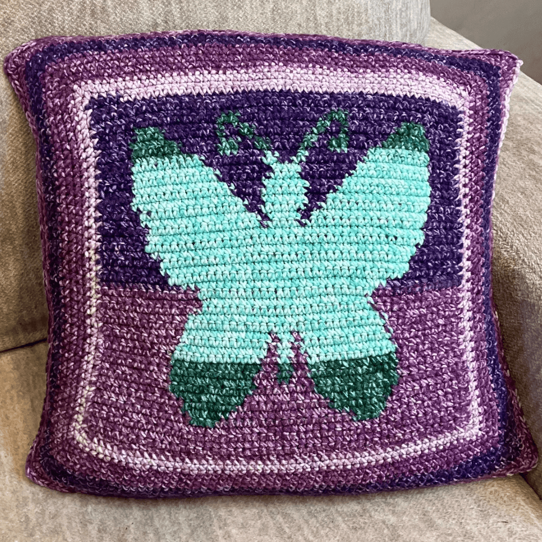 This pattern can be crocheted using a variety of colourwork techniques – intarsia, tapestry, or stranded colourwork, to create a unique butterfly motif that reflects your personal style. Measuring approximately 15 inches, the finished cushion is the ideal size to cosy up with on your sofa, bed, or favourite chair.