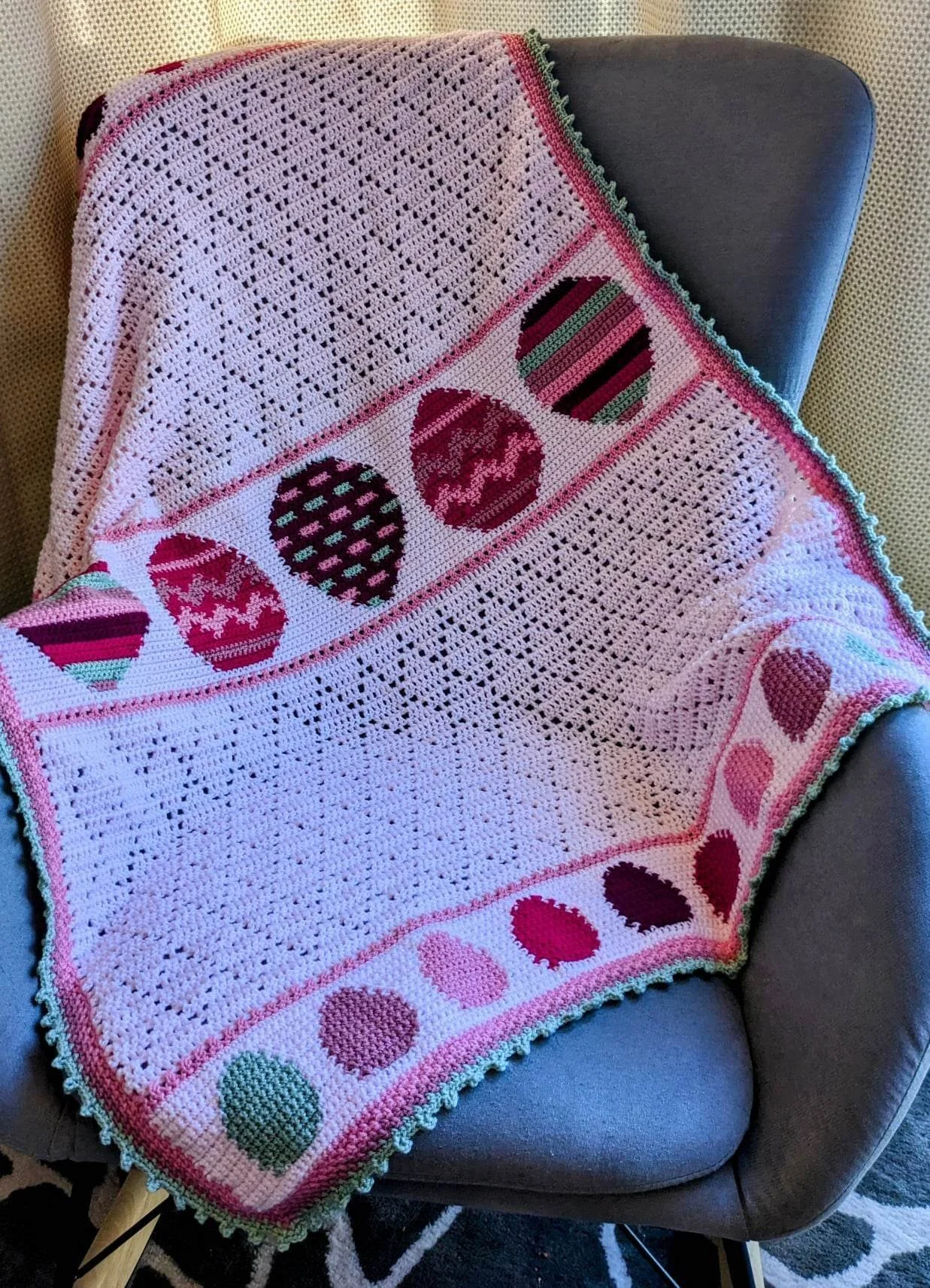 Our beautiful Easter egg-themed blanket crochet pattern makes an adorable baby blanket – perfect for gifting at your next baby shower 😊. This baby-sized afghan will keep your gorgeous bundle of joy feeling safe and warm.